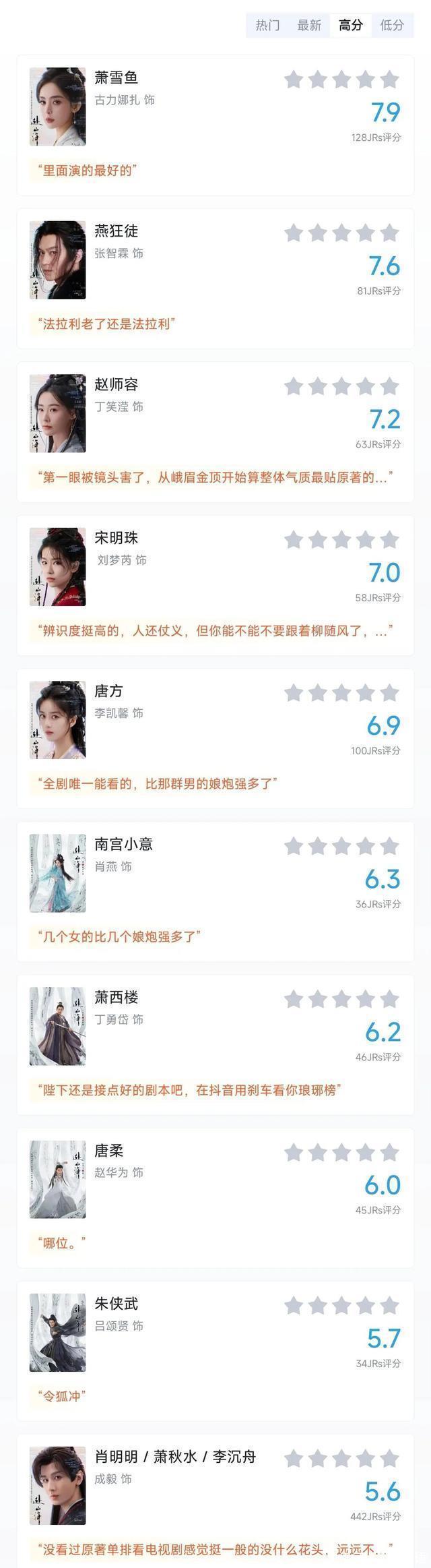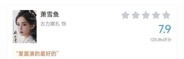 演技可以说是全剧第一,尤其是最后为了侠义死也不倒,把大侠风骨诠释的淋漓尽致。 第一名:古力娜扎(萧雪鱼)7.9分
